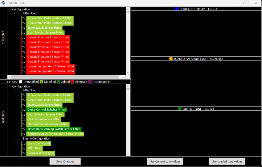 To import the value from the new file, click Use Loaded tune Values.