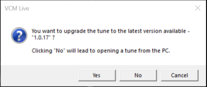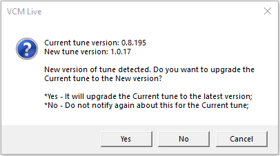 If the tune file that you have open has an older file format than the default tunes for your current version of  VCM Live, you can upgrade it to the current file format. This allows you to include all the newest parameters supported by the ECU.
