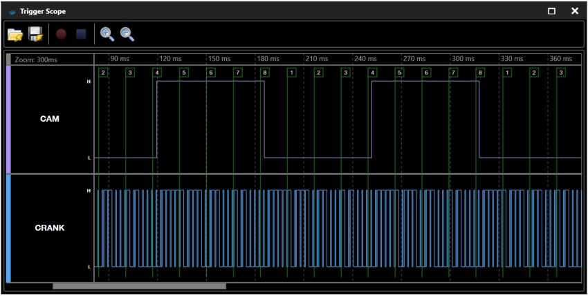 The Trigger scope window is useful when you want to examine cam and crank signals at a higher rate of sampling than is possible in a Time Graph subwindow. To open this window, select ECU > Trigger Scope in the menu bar.